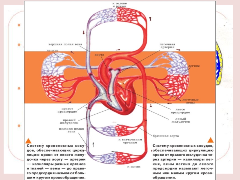 Центром кровеносной системы является сердце, выполняющее роль двух насосов. Правая сторона сердца (венозная) продвигает кровь по малому кругу кровообращения, левая (артериальная) - по большому кругу.