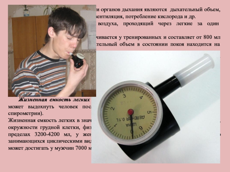 Слайд 10 Показателями работоспособности органов дыхания являются дыхательный объем,