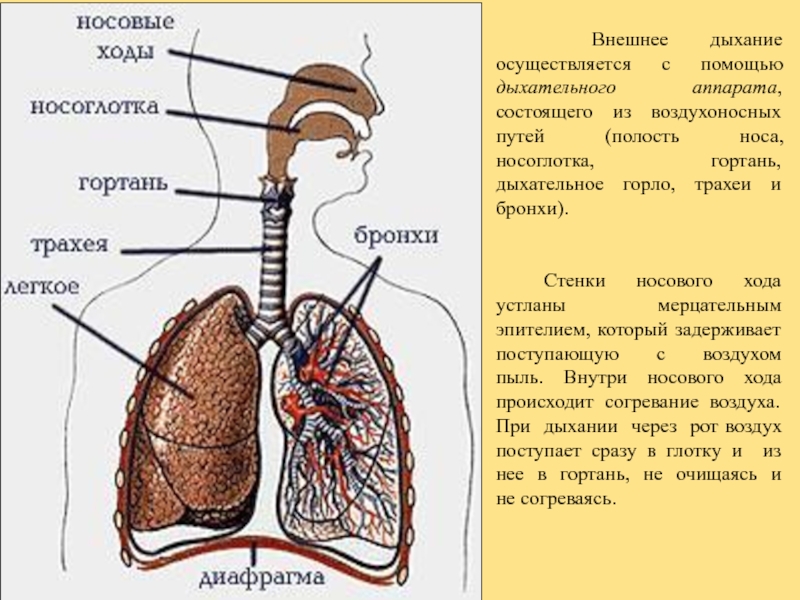 Слайд 8 Внешнее дыхание осуществляется с помощью дыхательного