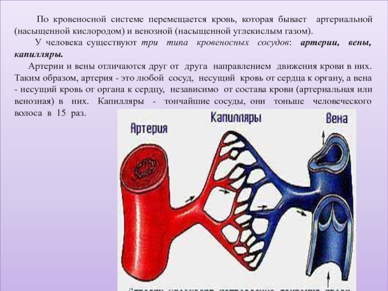 Артерии и вены отличаются друг от друга направлением движения крови в них. Таким образом, артерия - это любой сосуд, несущий кровь от сердца к органу, а вена - несущий кровь от органа к сердцу, независимо от состава крови (артериальная или венозная) в них. Капилляры - тончайшие сосуды, они тоньше человеческого волоса в 15 раз.