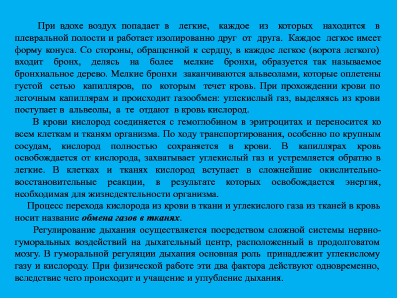 Регулирование дыхания осуществляется посредством сложной системы нервно-гуморальных воздействий на дыхательный центр, расположенный в продолговатом мозгу. В гуморальной регуляции дыхания основная роль принадлежит углекислому газу и кислороду. При физической работе эти два фактора действуют одновременно, вследствие чего происходит и учащение и углубление дыхания.