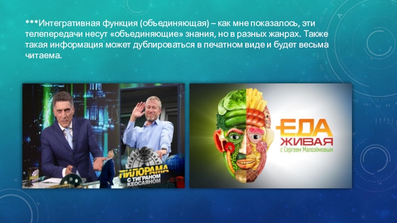 Слайд 7***Интегративная функция (объединяющая) – как мне показалось, эти телепередачи несут
