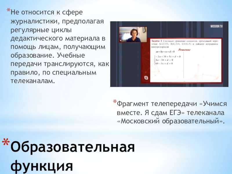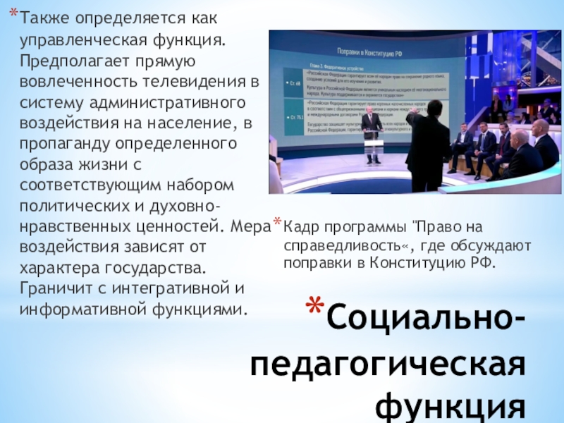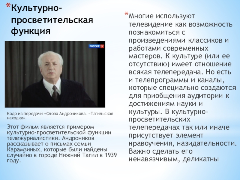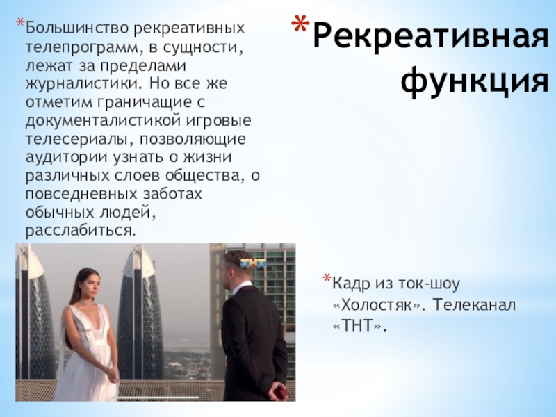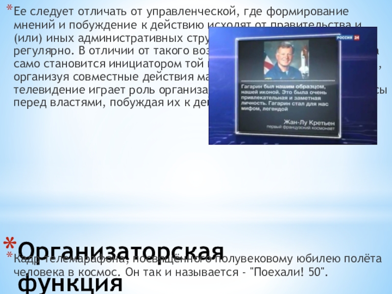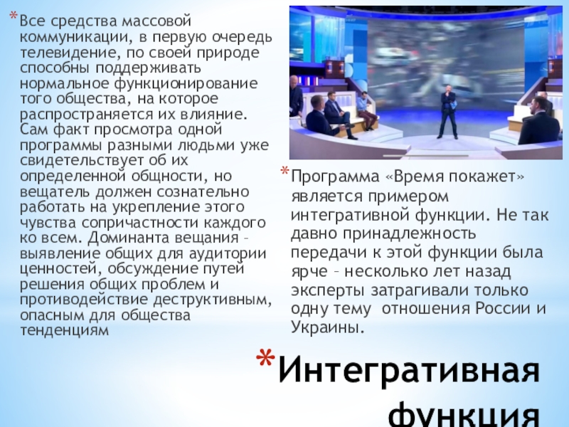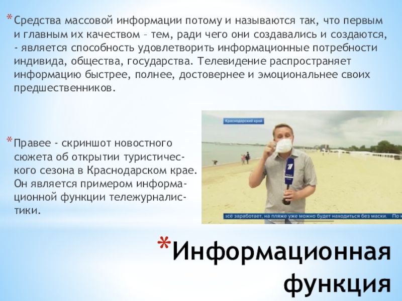 и создаются, - является способность удовлетворить информационные потребности индивида, общества, государства. Телевидение распространяет информацию быстрее, полнее, достовернее и эмоциональнее своих предшественников.Правее - скриншот новостного сюжета об открытии туристичес- кого сезона в Краснодарском крае. Он является примером информа- ционной функции тележурналис- тики.