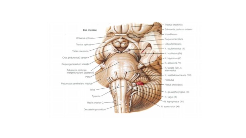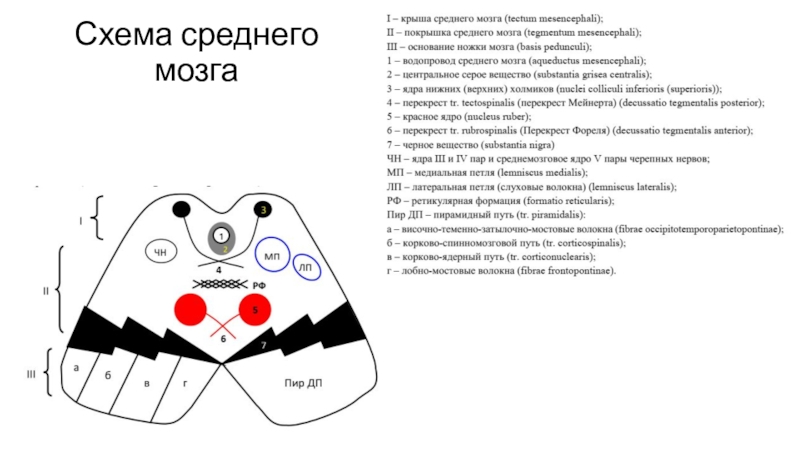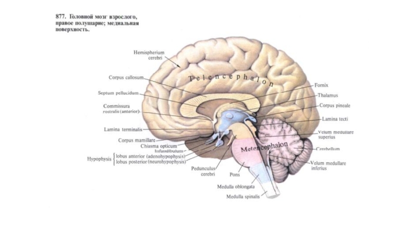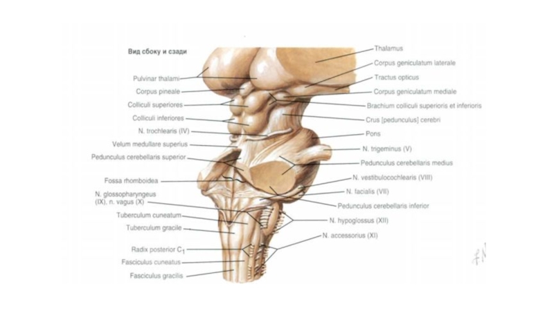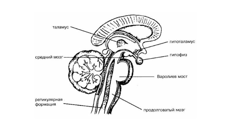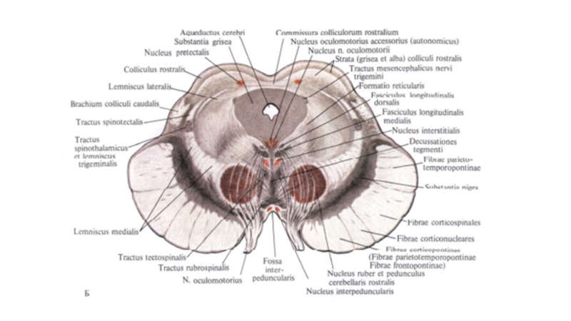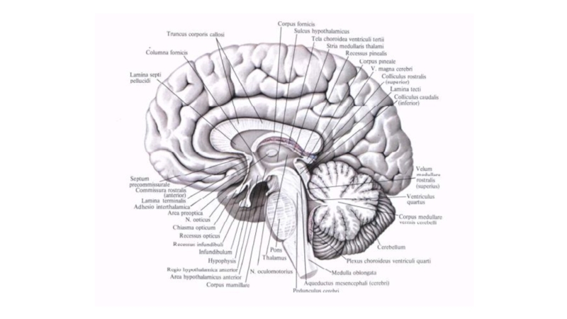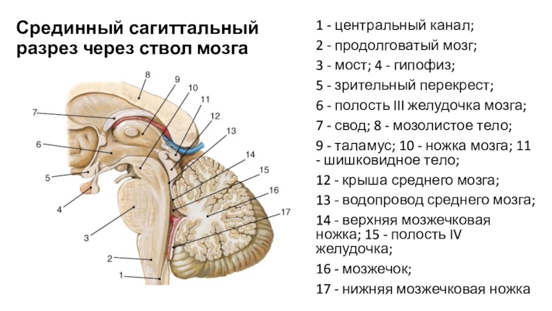 Слайд 5Срединный сагиттальный разрез через ствол мозга