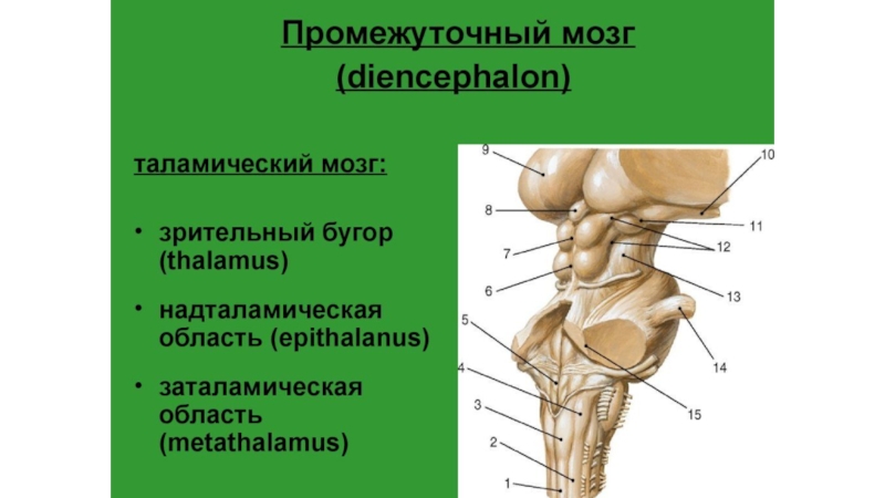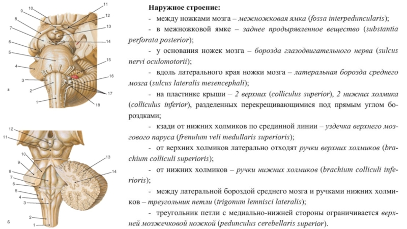 8 - лицевой бугорок; 9 - средняя мозжечковая ножка; 10 - верхняя мозжечковая ножка; 11 - пластина крыши среднего мозга (четверохолмие); 12 - эпифиз; 13 - кора мозжечка; 14 - зубчатое ядро