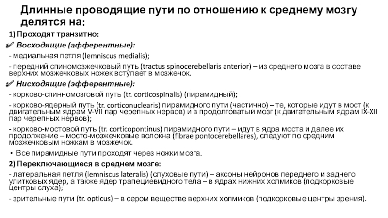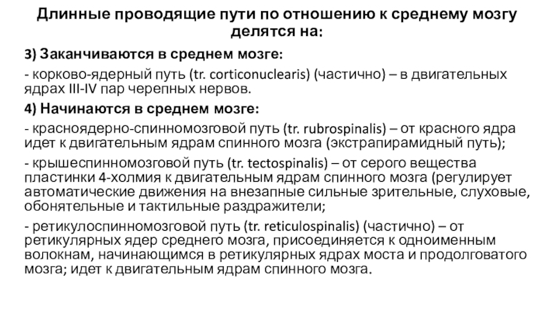 Слайд 13Длинные проводящие пути по отношению к среднему мозгу делятся на: