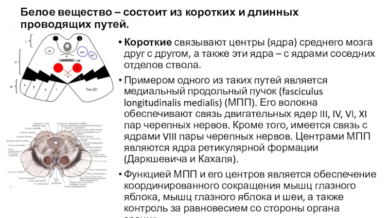 Примером одного из таких путей является медиальный продольный пучок (fasciculus longitudinalis medialis) (МПП). Его волокна обеспечивают связь двигательных ядер III, IV, VI, XI пар черепных нервов. Кроме того, имеется связь с ядрами VIII пары черепных нервов. Центрами МПП являются ядра ретикулярной формации (Даркшевича и Кахаля).