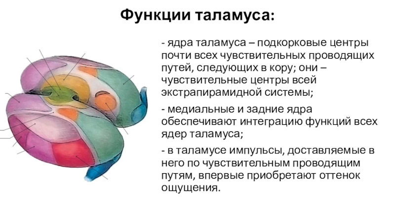 - в таламусе импульсы, доставляемые в него по чувствительным проводящим путям, впервые приобретают оттенок ощущения.