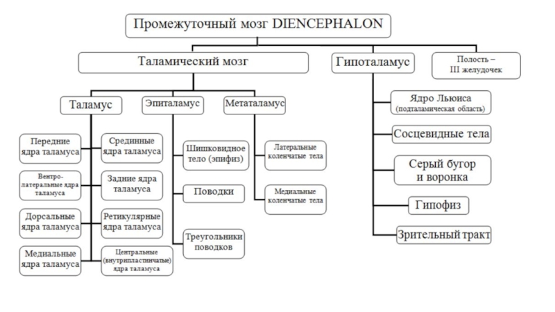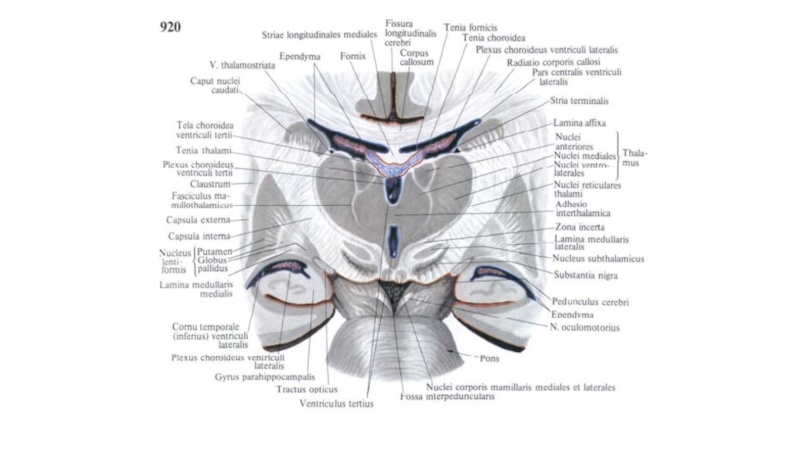 - дорсальная поверхность таламуса покрыта белым веществом;