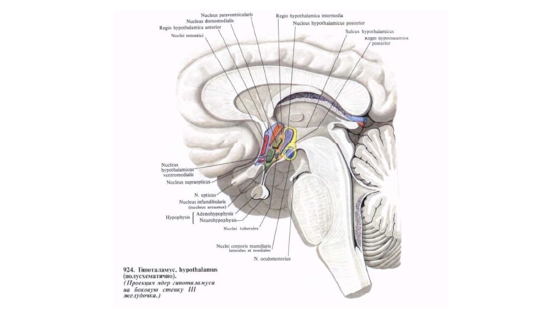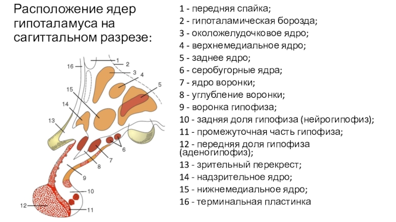 Слайд 25Расположение ядер гипоталамуса на сагиттальном разрезе: