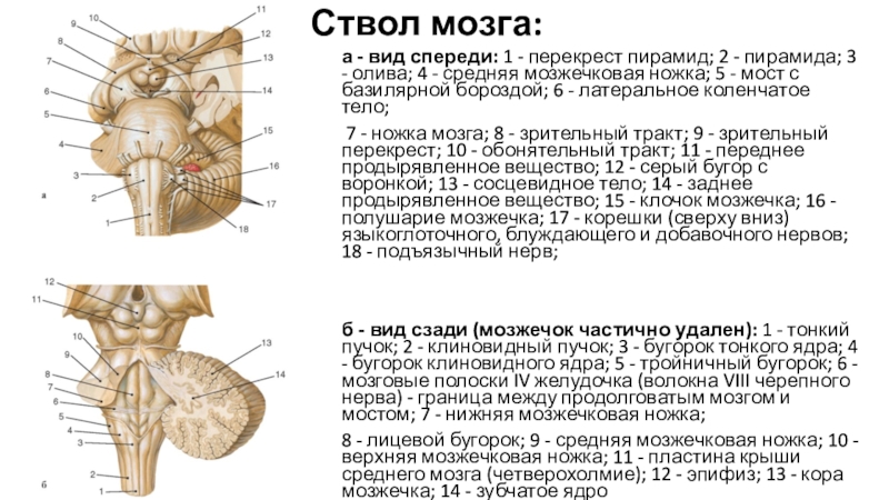 б - вид сзади (мозжечок частично удален): 1 - тонкий пучок; 2 - клиновидный пучок; 3 - бугорок тонкого ядра; 4 - бугорок клиновидного ядра; 5 - тройничный бугорок; 6 - мозговые полоски IV желудочка (волокна VIII черепного нерва) - граница между продолговатым мозгом и мостом; 7 - нижняя мозжечковая ножка;