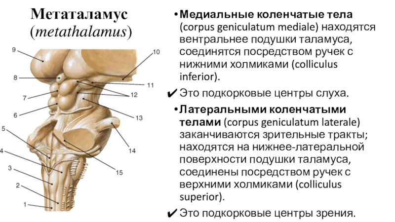 Медиальные коленчатые тела (corpus geniculatum mediale) находятся вентральнее