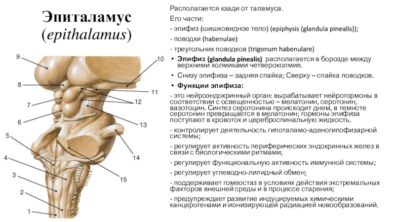 - это нейроэндокринный орган: вырабатывает нейрогормоны в соответствии с освещенностью – мелатонин, серотонин, вазотоцин. Синтез серотонина происходит днем, в темноте серотонин превращается в мелатонин; гормоны эпифиза поступают в кровоток и цереброспинальную жидкость.