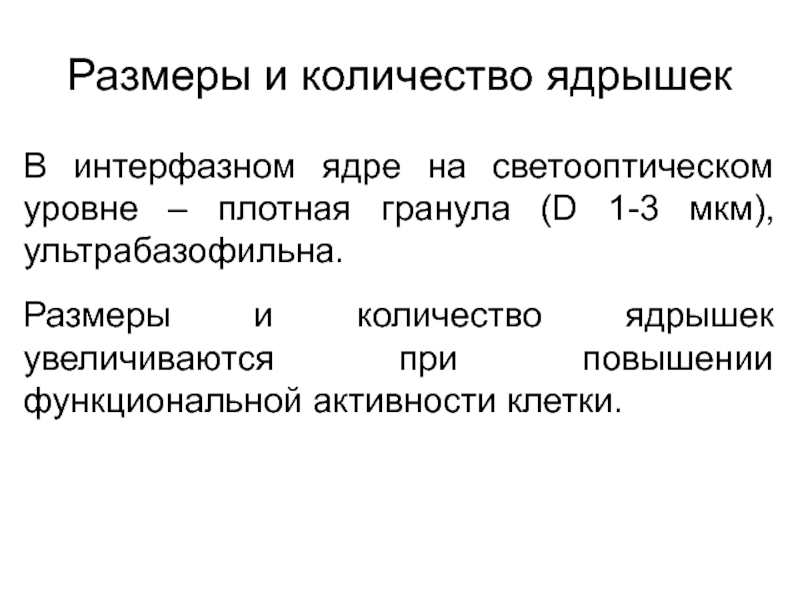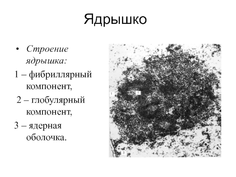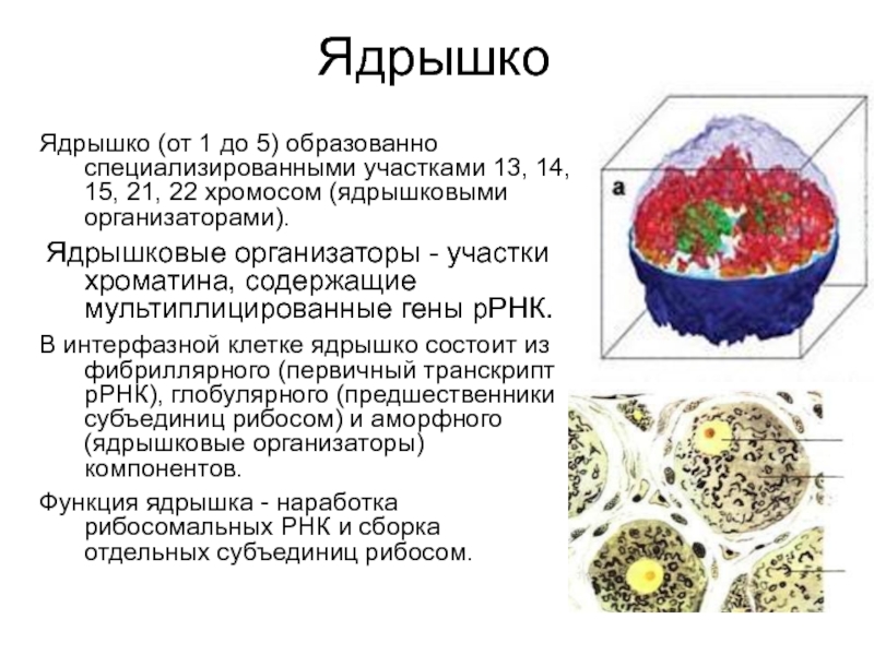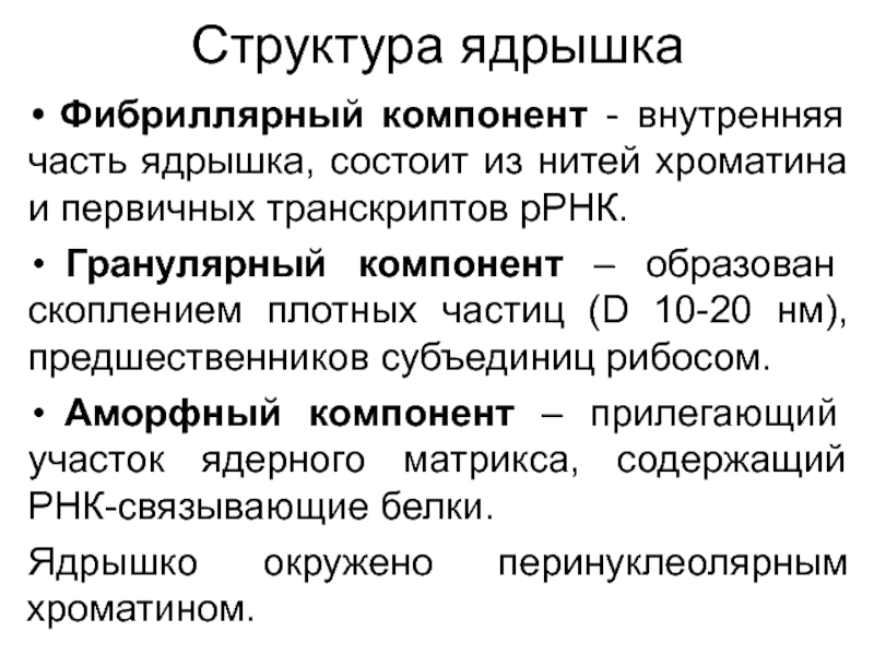 В интерфазной клетке ядрышко состоит из фибриллярного (первичный транскрипт рРНК), глобулярного (предшественники субъединиц рибосом) и аморфного (ядрышковые организаторы) компонентов.