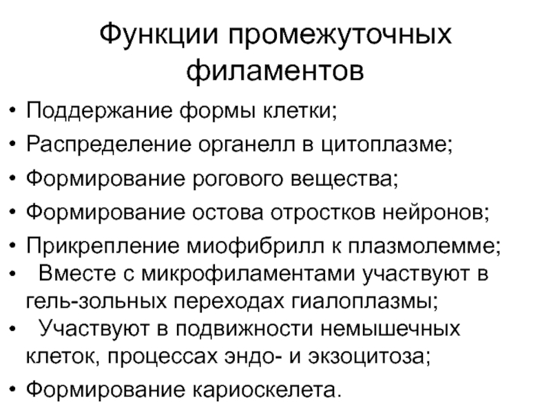 В целом цитоскелет ответственен за поддержание и изменение формы клеток, за все способы внутриклеточного движения и транспорта, за движение клеток в пространстве, образование контактов и прикрепление клеток к межклеточному веществу и передачу сигнала от мембранного рецептора внутрь клетки.