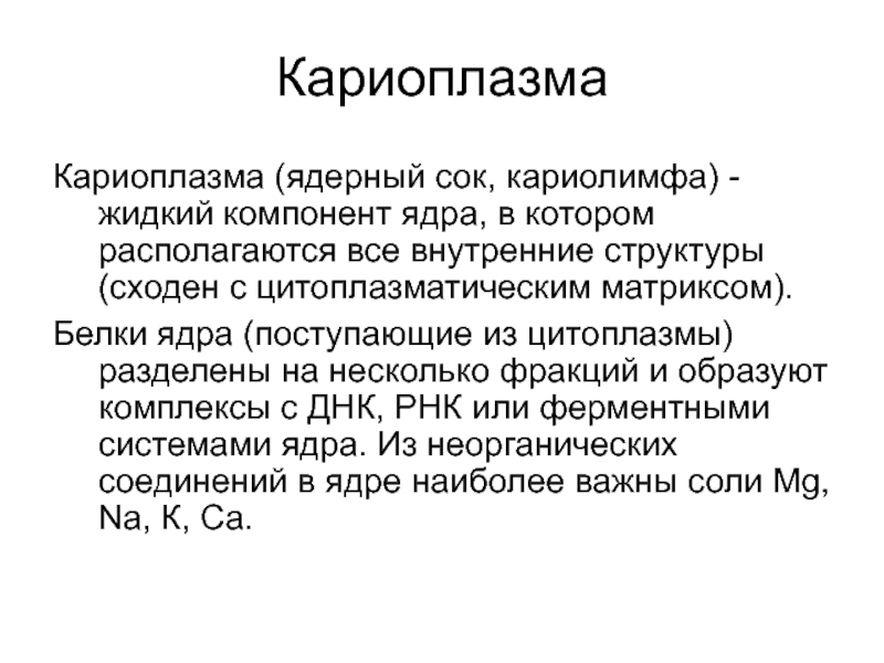 Кариоплазма - жидкий компонент ядерного матрикса, коллоидный раствор, содержащий РНК, гликопротеины, ионы, ферменты.