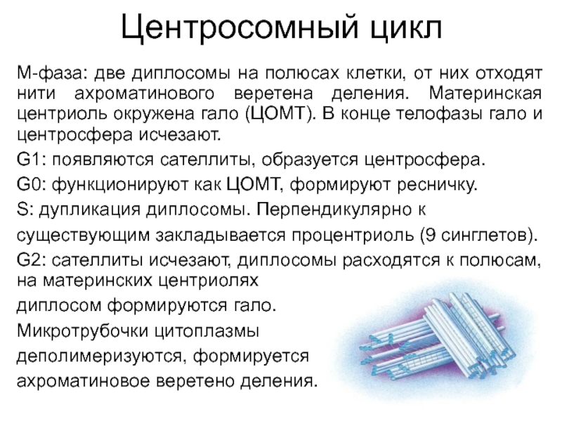 нити ахроматинового веретена деления. Материнская центриоль окружена гало (ЦОМТ). В