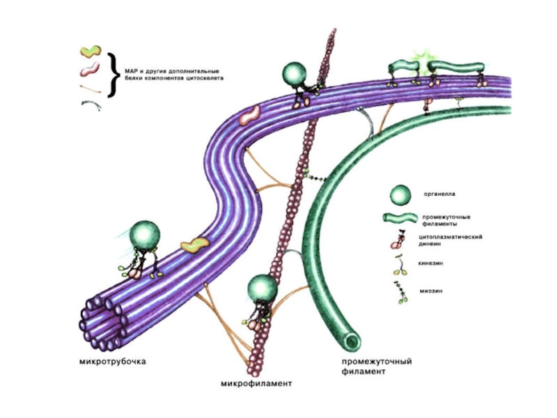 Структуры цитоскелета прикрепляются к различным органеллам и плазмолемме, а так же соединяются между собой через систему якорных белков (анкирин, винкулин, белок 4.1 и др.).