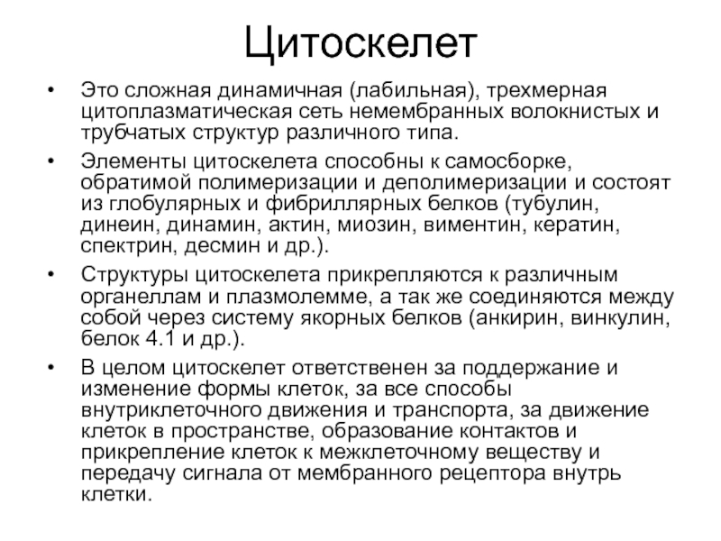 обратимой полимеризации и деполимеризации и состоят из глобулярных и фибриллярных белков (тубулин, динеин, динамин, актин, миозин, виментин, кератин, спектрин, десмин и др.).