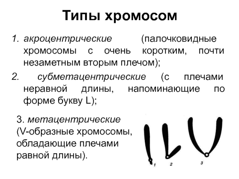3. метацентрические (V-образные хромосомы, обладающие плечами равной длины).
