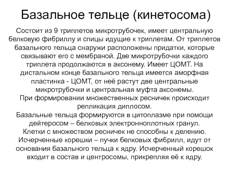 На вертикальном разрезе ресничка состоит из корешка, базального тельца (в