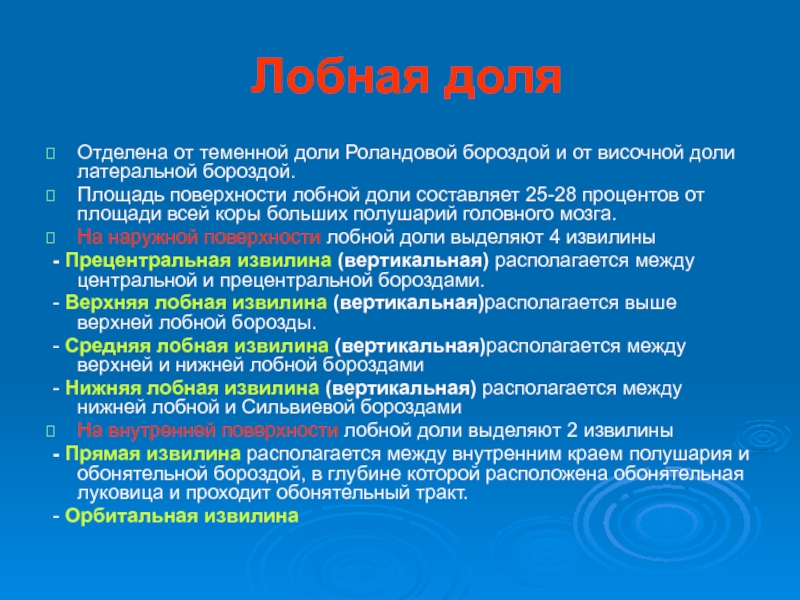 расположенные примерно горизонтально: верхнюю, лобную, среднюю и нижнюю, лобные извилины.