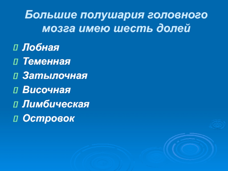 Слайд 4Большие полушария головного мозга имею шесть долей