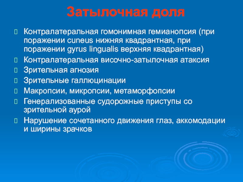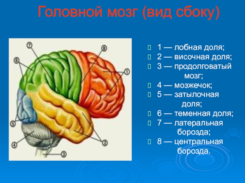 коры головного мозга: лобная, теменная, височная и затылочная (по другому