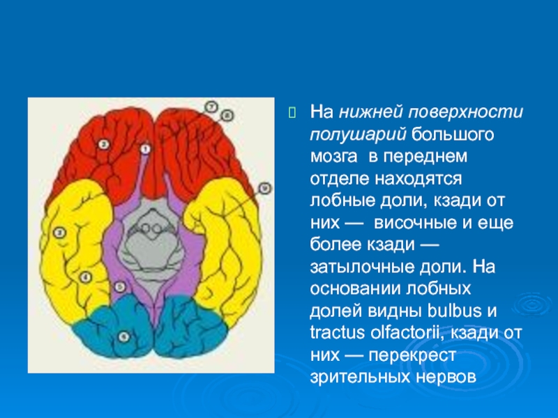 кзади — затылочные доли. На основании лобных долей видны bulbus и tractus olfactorii, кзади от них — перекрест зрительных нервов