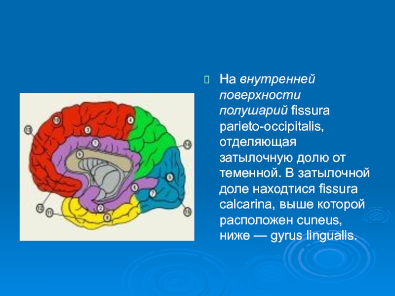 Слайд 13На внутренней поверхности полушарий fissura раrieto-occipitalis, отделяющая затылочную долю от