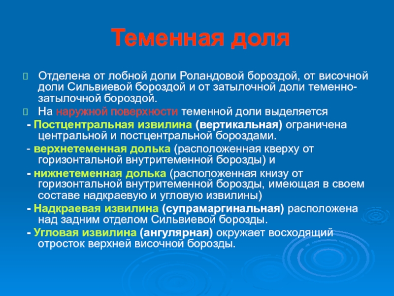 делится на верхнюю и нижнюю теменные дольки. В нижней теменной