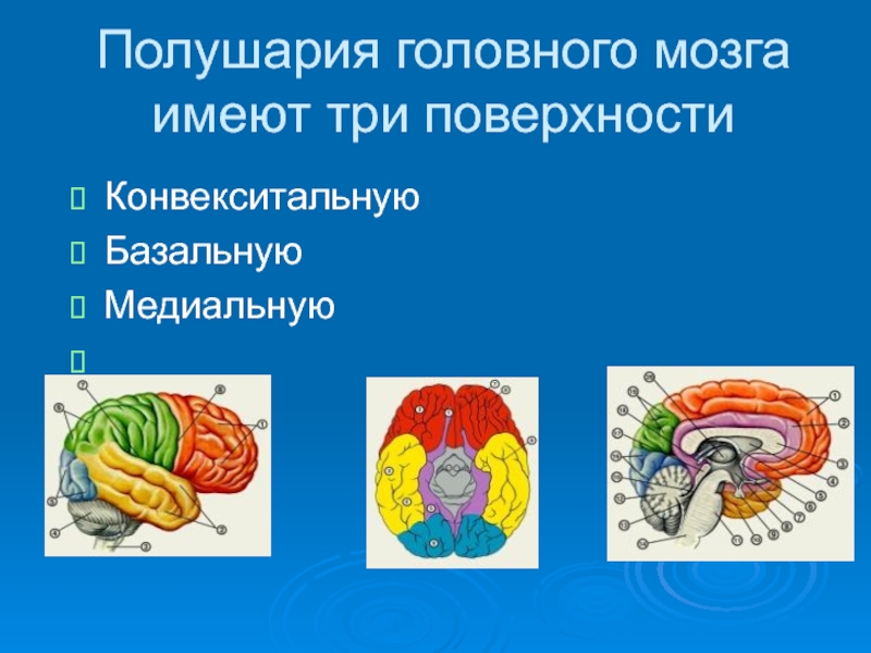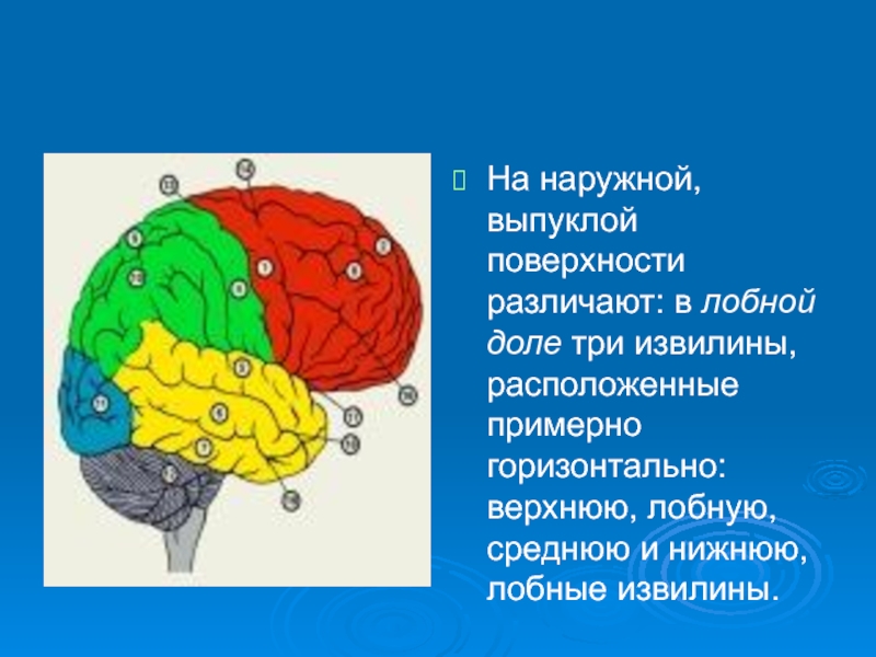 Слайд 10На наружной, выпуклой поверхности различают: в лобной доле три извилины,