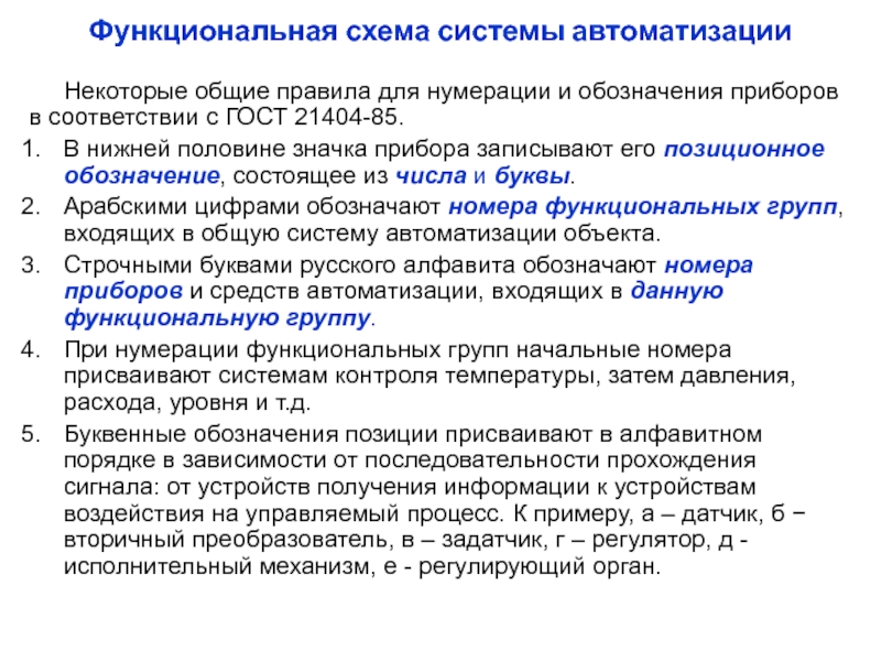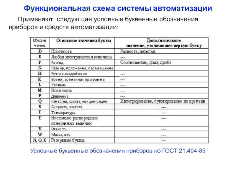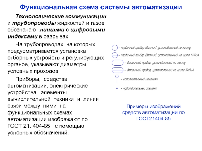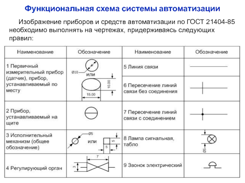 процесса.Составляют функциональную схему автоматизации узла, агрегата или объекта в соответствии с ГОСТ 21404-85 «Автоматизация технологических процессов. Обозначения условные приборов и средств автоматизации в схемах». Применение этого стандарта является обязательным для всех проектных организаций. В нем установлены условные обозначения приборов, средств автоматизации и линий связи между ними, применяемые при выполнении схем автоматизации технологических процессов.