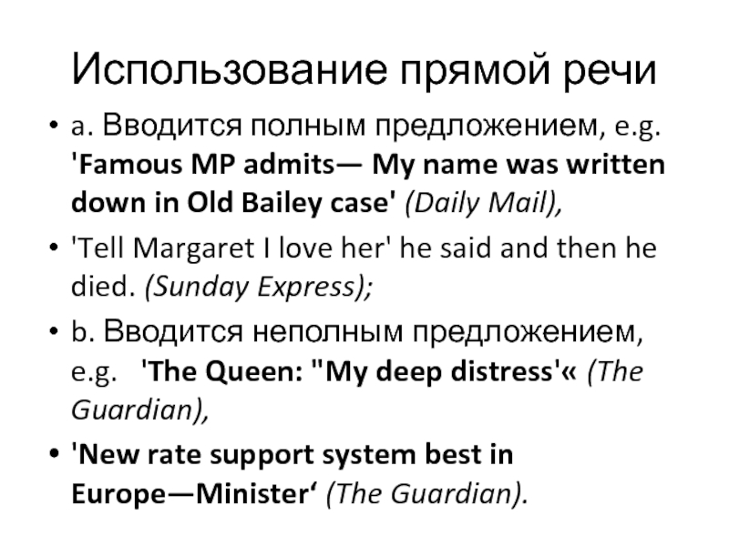 b. Вводится неполным предложением, e.g. 'The Queen: "My deep distress'« (The Guardian),