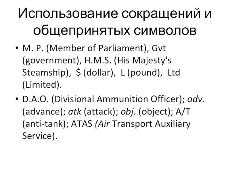 (government), H.M.S. (His Majesty's Steamship), $ (dollar), L (pound), Ltd