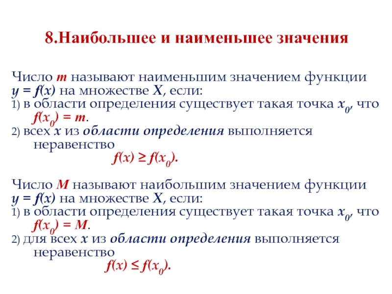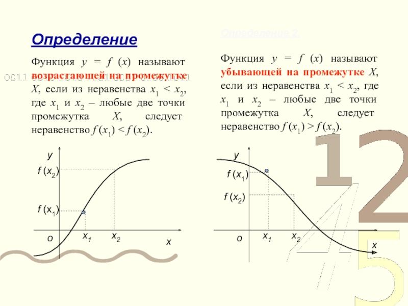Функция у = f (х) называют убывающей на промежутке Х, если из неравенства х1 < х2, где х1 и х2 – любые две точки промежутка Х, следует неравенство f (х1) > f (х2).