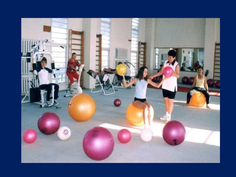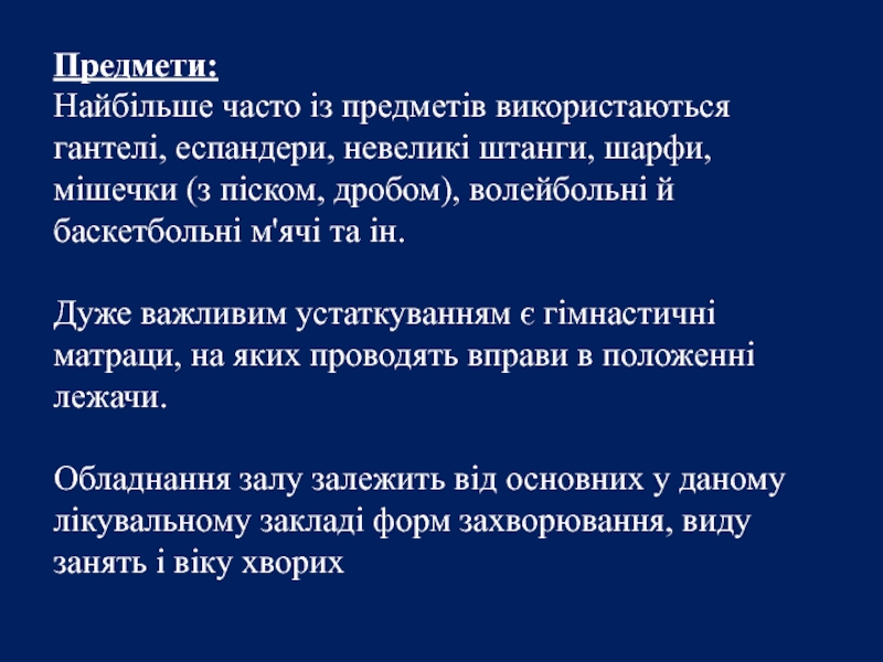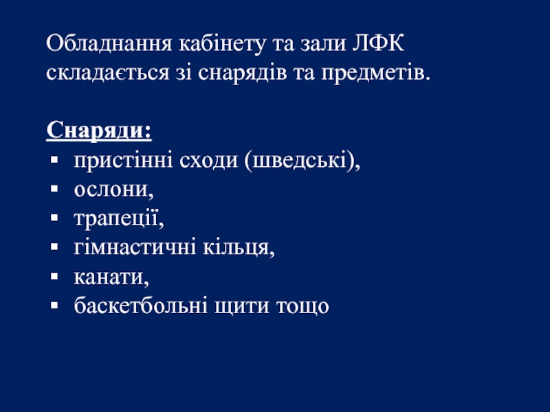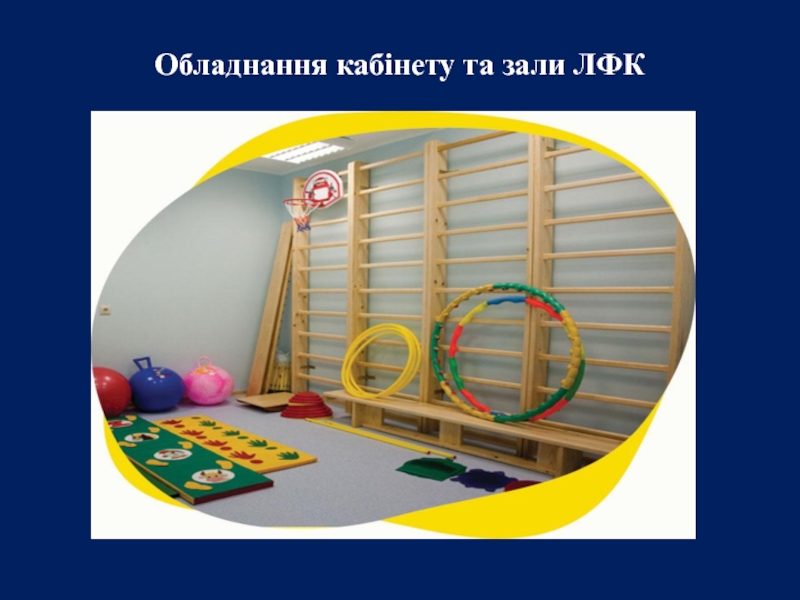 Слайд 11Обладнання кабінету та зали ЛФК складається зі снарядів та предметів.