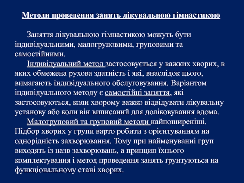 Слайд 23Методи проведення занять лікувальною гімнастикою