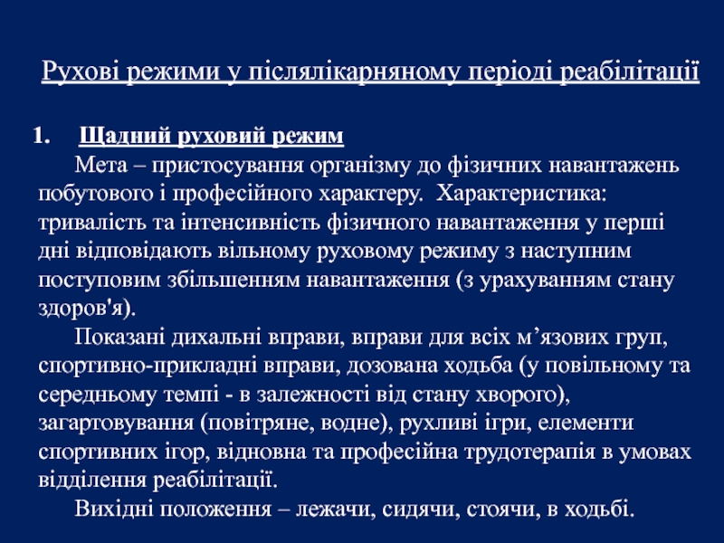 Слайд 17Рухові режими у післялікарняному періоді реабілітації