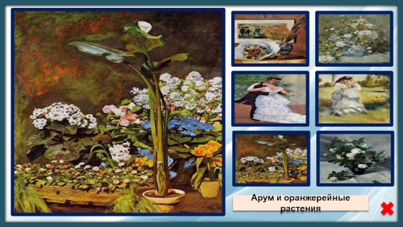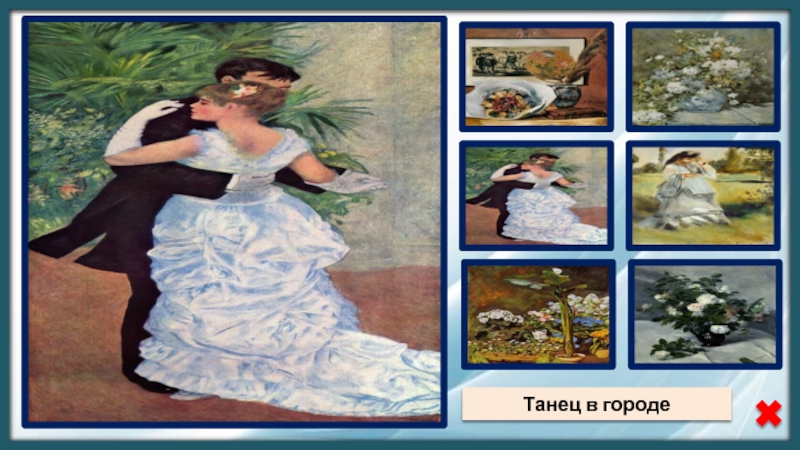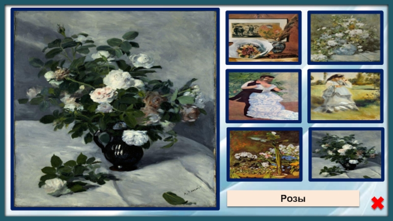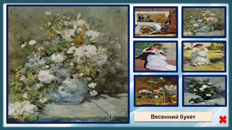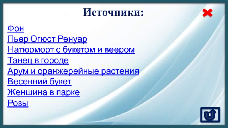 Источники:ФонПьер Огюст РенуарНатюрморт с букетом и вееромТанец в городеАрум и оранжерейные растенияВесенний букетЖенщина в паркеРозы