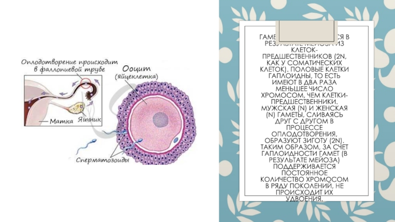 два раза меньшее число хромосом, чем клетки-предшественники. Мужская (n) и женская (n) гаметы, сливаясь друг с другом в процессе оплодотворения, образуют зиготу (2n).