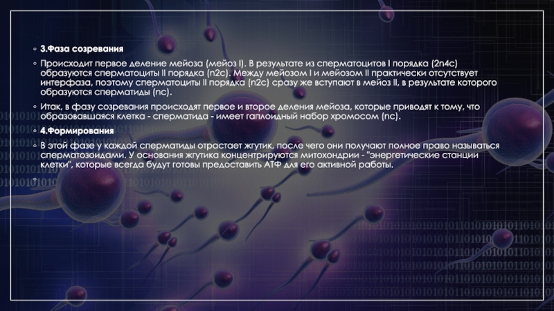 увидите некоторые отличия. Например, фаза формирования, характерная для сперматогенеза, здесь