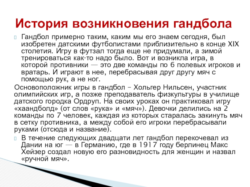 тогда еще не придумали, а зимой тренироваться как-то надо было. Вот и возникла игра, в которой противники — это две команды по 6 полевых игроков и вратарь. И играют в нее, перебрасывая друг другу мяч с помощью рук, а не ног.Основоположник игры в гандбол – Хольгер Нильсен, участник олимпийских игр, а позже преподаватель физкультуры в училище датского городка Ордруп. На своих уроках он практиковал игру «хаандболд» (от слов «рука» и «мяч»). Девочки делились на 2 команды по 7 человек, каждая из которых старалась закинуть мяч в сетку противника, а между собой его игроки перебрасывали руками (отсюда и название).