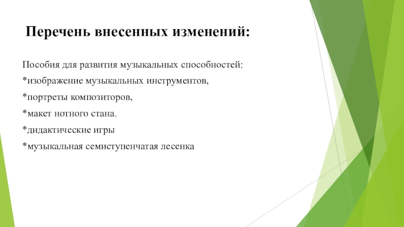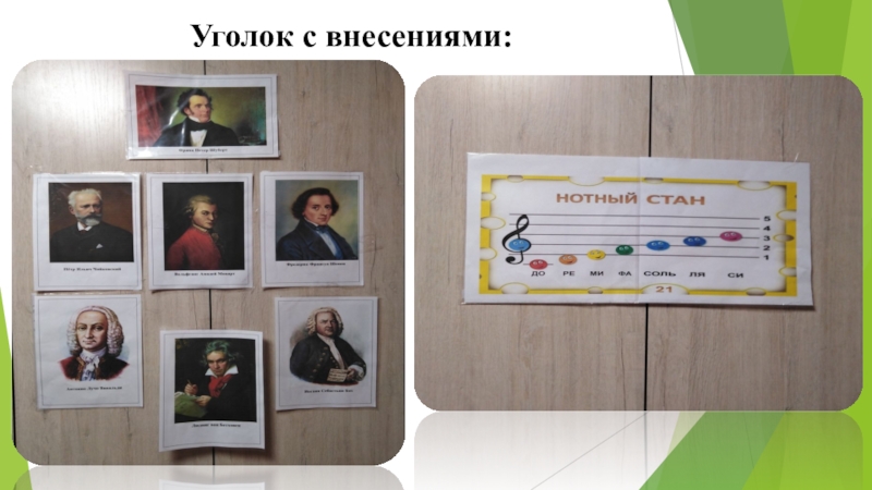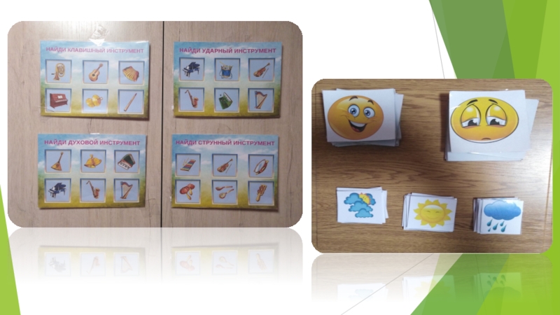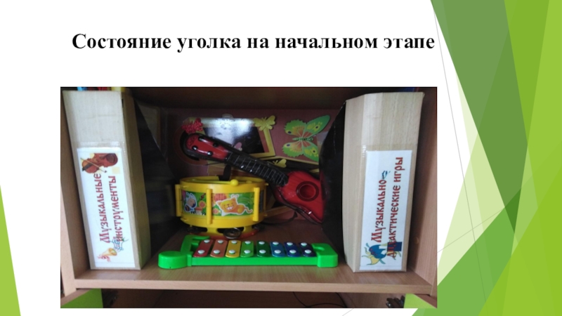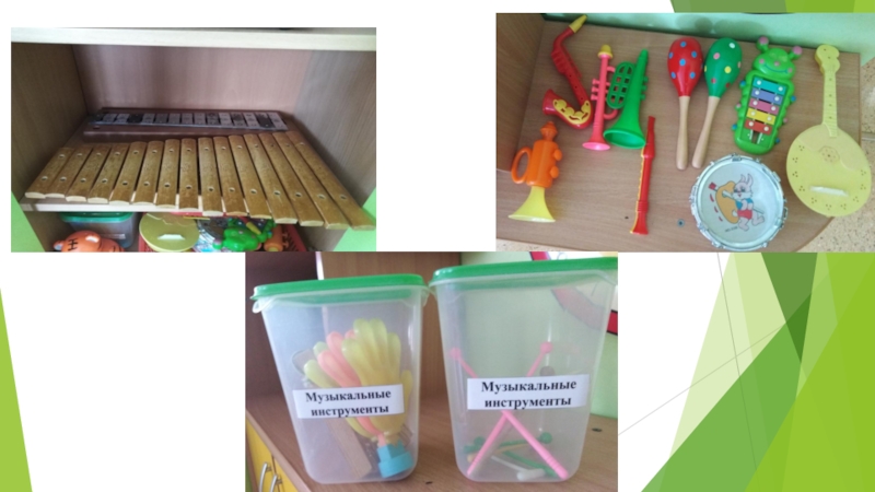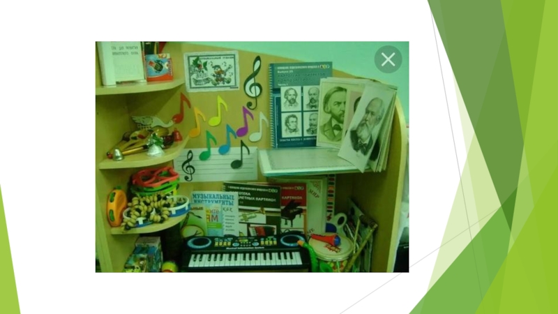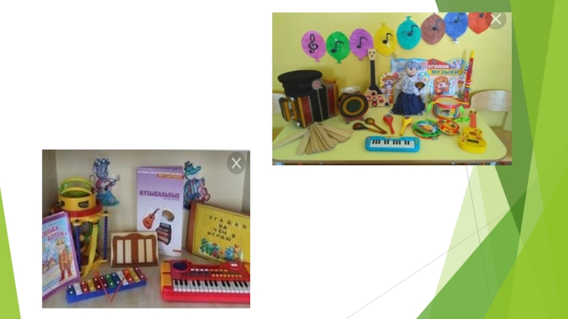 том числе самодельные); игрушки с фиксированной мелодией(музыкальные шкатулки, шарманки, звукомузыкальные игрушки с наборами мелодий, звуковые книжки, открытки); аудиосредства(магнитофон, музыкальный центр; аудиоматериалы с записями музыкальных произведений); альбомы с рисунками или фотографиями музыкальных инструментов;