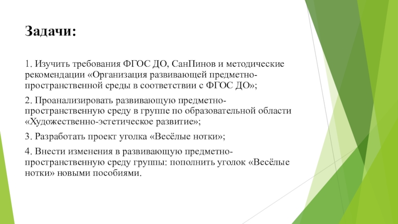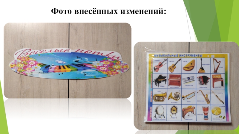 4. Внести изменения в развивающую предметно-пространственную среду группы: пополнить уголок «Весёлые нотки» новыми пособиями.