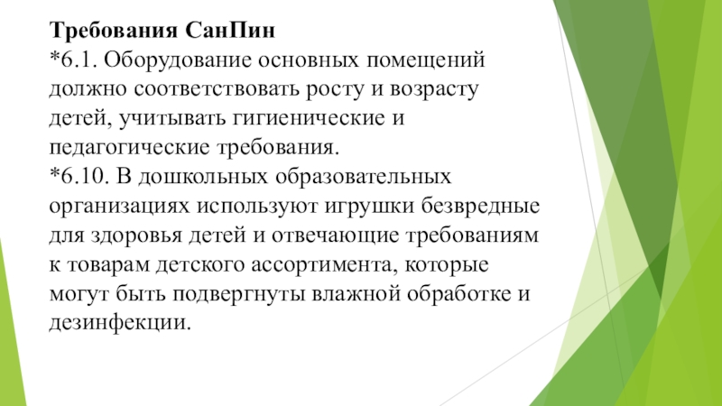 используют игрушки безвредные для здоровья детей и отвечающие требованиям к товарам детского ассортимента, которые могут быть подвергнуты влажной обработке и дезинфекции.
