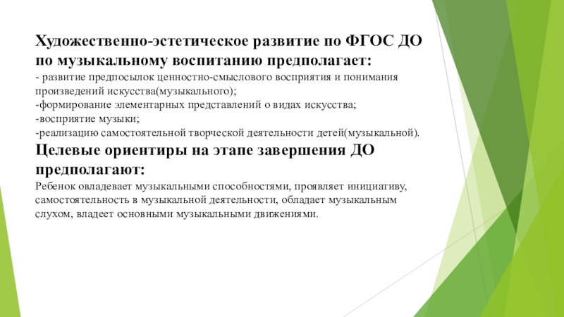Слайд 7Художественно-эстетическое развитие по ФГОС ДО по музыкальному воспитанию предполагает: