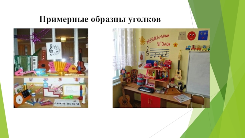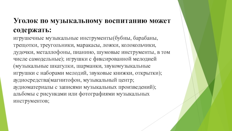 Слайд 12Уголок по музыкальному воспитанию может содержать: