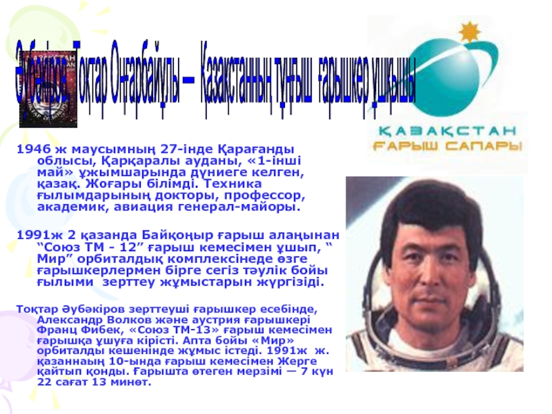 Әубәкіров, Тоқтар Оңғарбайұлы — Қазақстанның тұңғыш ғарышкер ұшқышы