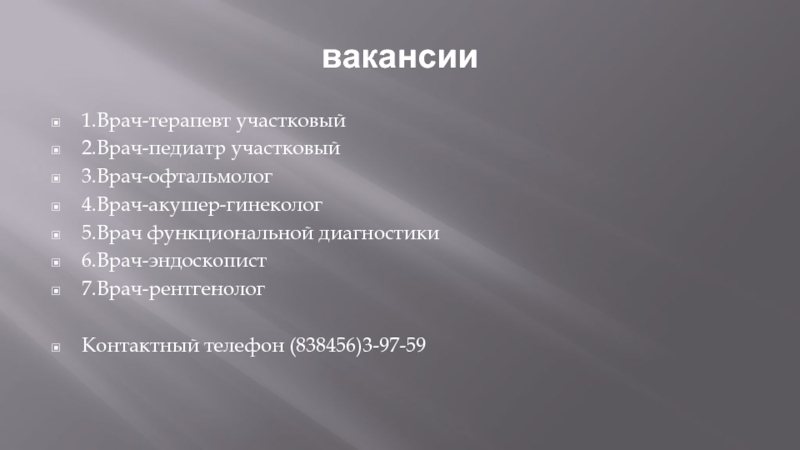 вакансии1.Врач-терапевт участковый2.Врач-педиатр участковый3.Врач-офтальмолог4.Врач-акушер-гинеколог5.Врач функциональной диагностики6.Врач-эндоскопист7.Врач-рентгенологКонтактный телефон (838456)3-97-59